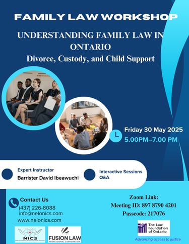 The objective of this workshop is to provide participants with a clear understanding of family law in Ontario, including topics such as separation and divorce, child custody and access, child and spousal support, and property division. The workshop educate individuals about their legal rights and responsibilities, available court and alternative dispute resolution processes, and community resources, empowering them to make informed decisions regarding family matters.
