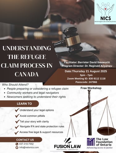Understanding the Refugee Claim in Canada: The workshop give participants clear understanding of how refugee claims are decided in Canada from eligibility to hearing with emphasis on internal flight alternative, state protection, and evidence preparation.